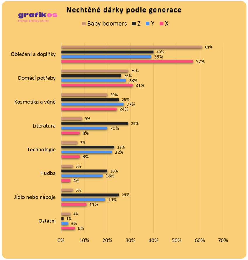 Zajímavý je také pohled na graf nechtěných dárků nejen podle pohlaví, ale také podle generace X, Y, Z a baby boomers, tedy podle věku. Kdo jsou jednotlivé generace podle Wikipedia?